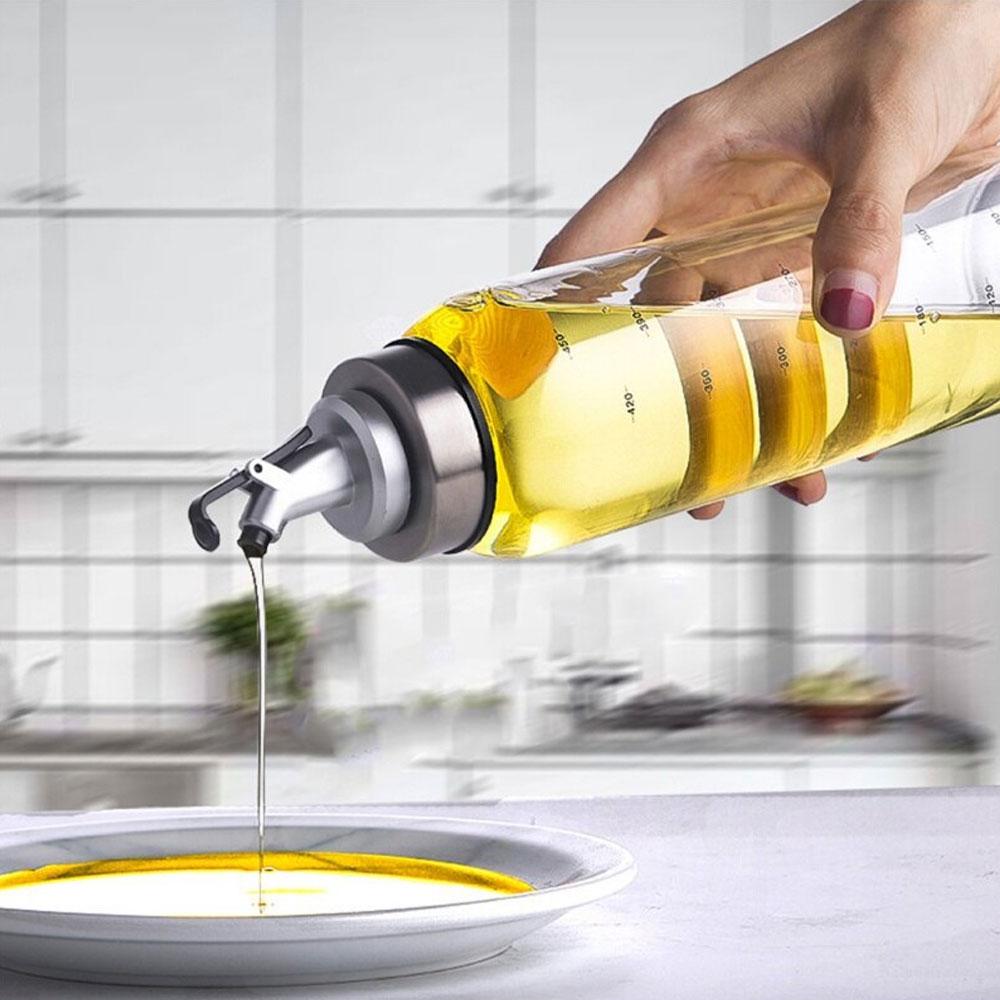 Great kitchen aid for storing, pouring and measuring.The special curving spout design of the bottle mouth, makes the oil flow evenly without any unwanted oil drip/spills on the top of the bottle, very clean to use.